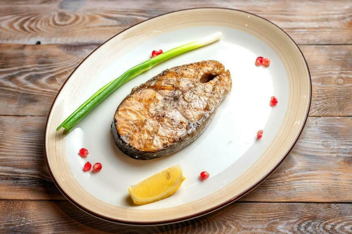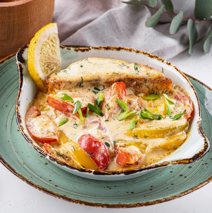 Филе судака, болгарский перец, томаты розовые, сливки, зелень, лимон, зеленый лук, грузинские специи
