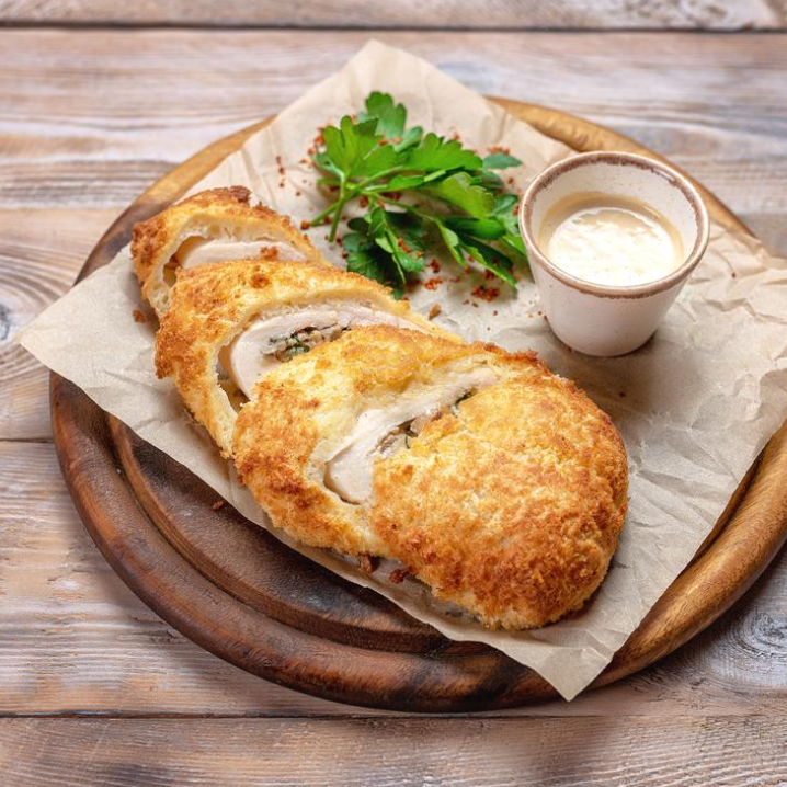 Куриное филе, фаршированное сыром, зеленью и грибами с соусом Баже.