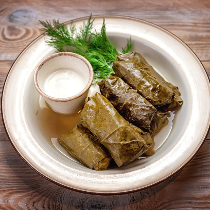 Популярное кавказское блюдо из бараньего фарша с рисом в виноградных листьях. Подается с чесночным мацони.