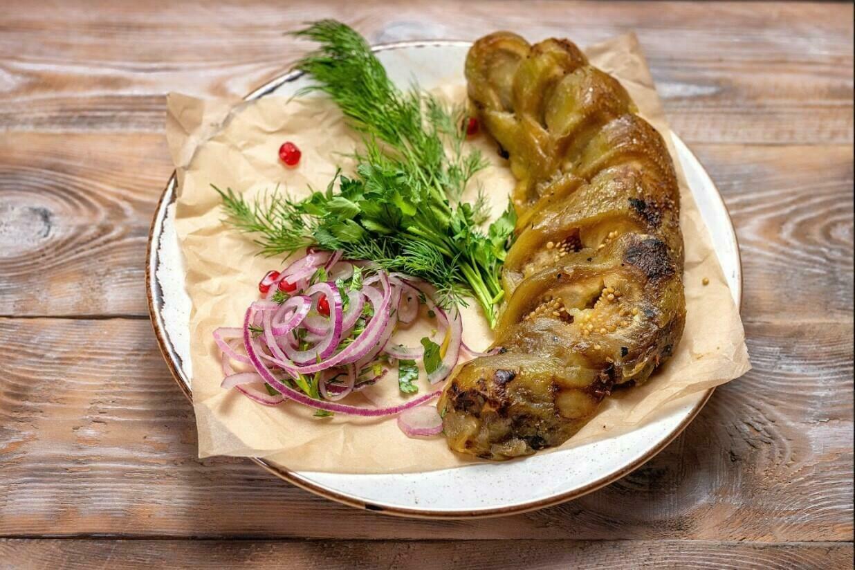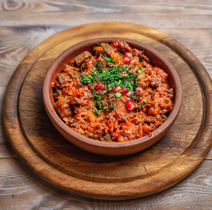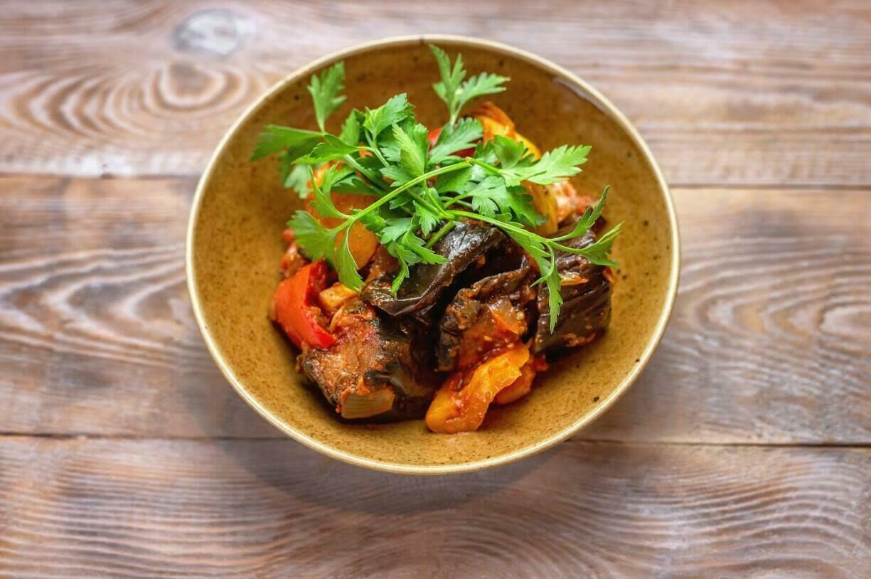 Традиционное грузинское овощное рагу из тушенных баклажанов, томатов, болгарского перца и зелени.