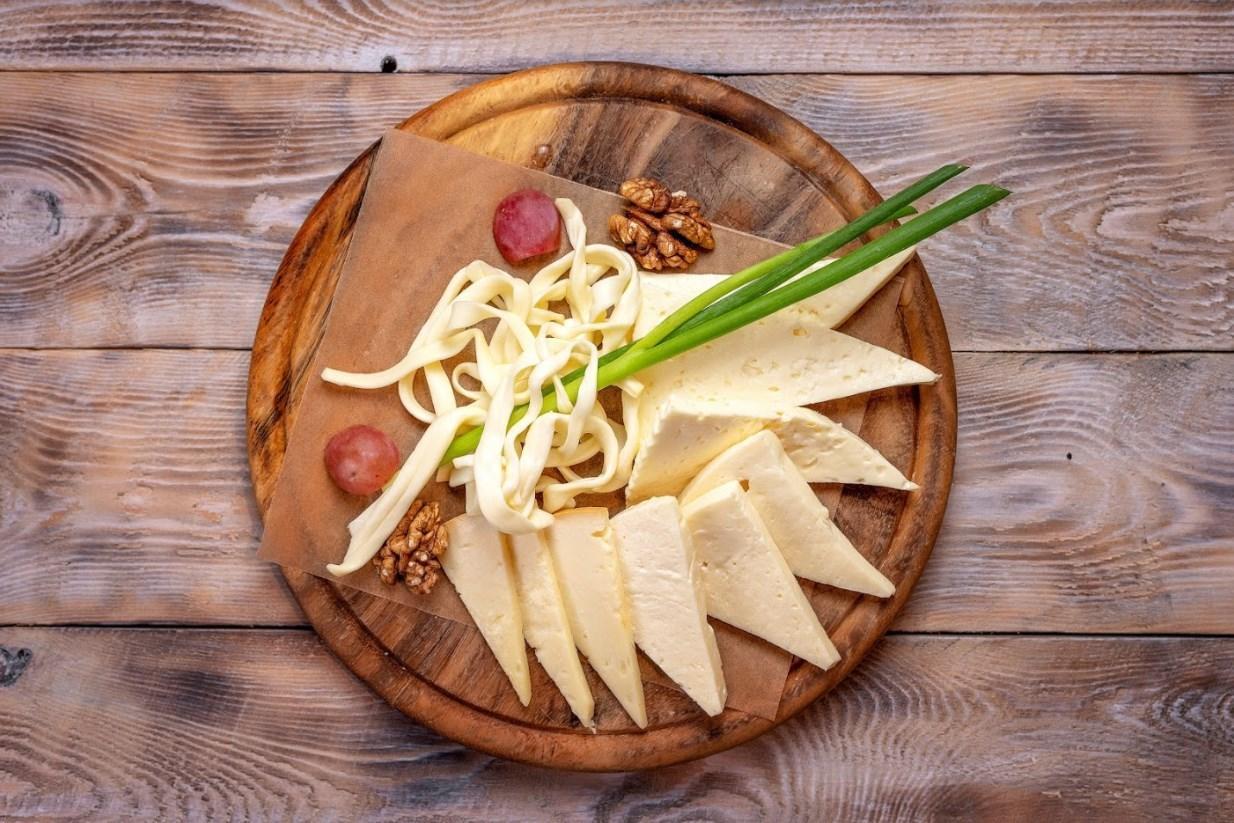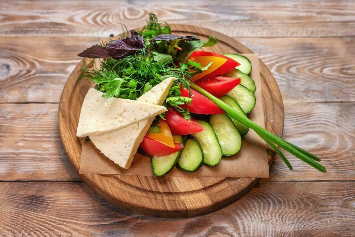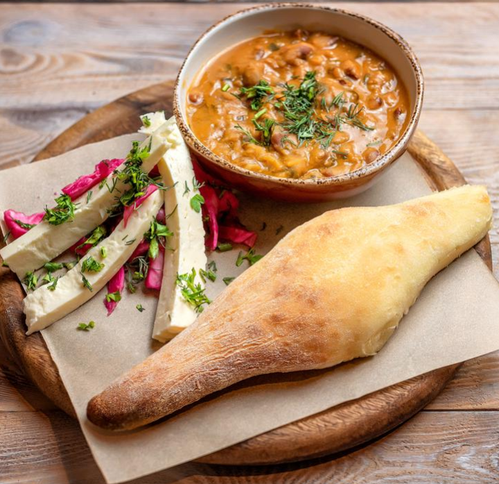 Подается с соленьями, домашним сыром и грузинским хлебом.