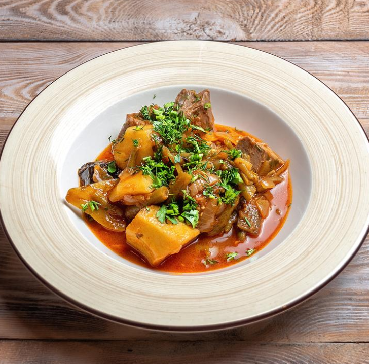 Тушеное рагу с бараниной, баклажанами, картофелем, томатами, болгарским перцем, зеленью и грузинскими специями.