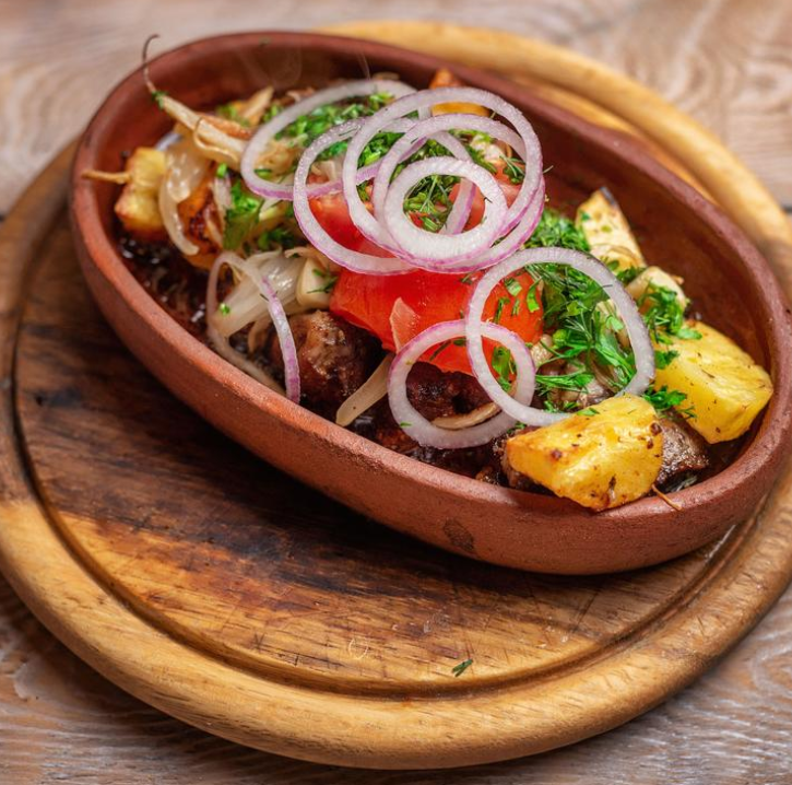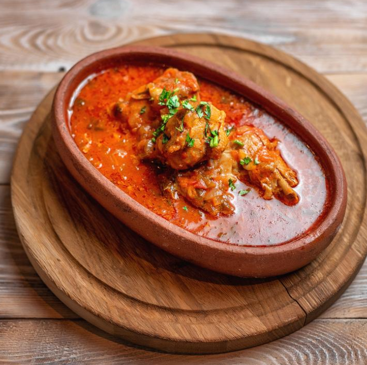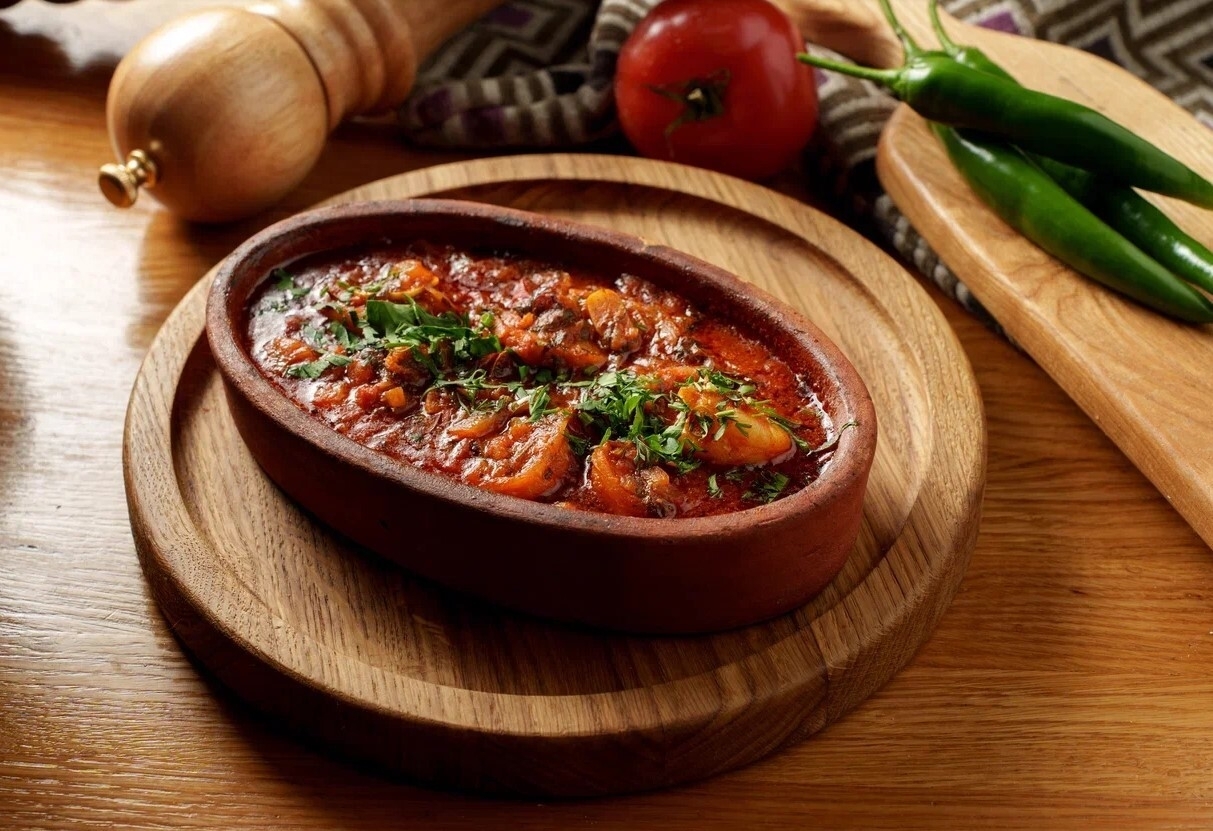 Аппетитные кусочки телятины, тушенные с болгарским перцем, спелыми томатами, луком и грузинскими специями.