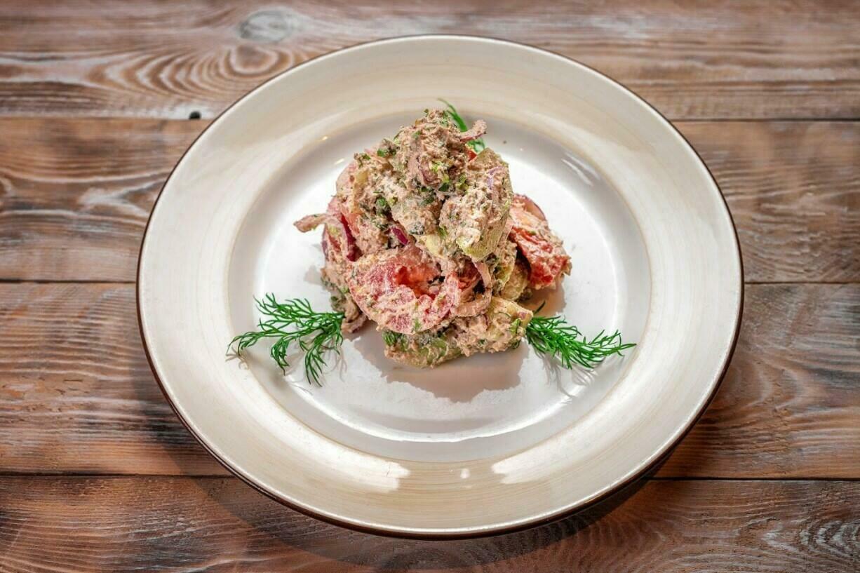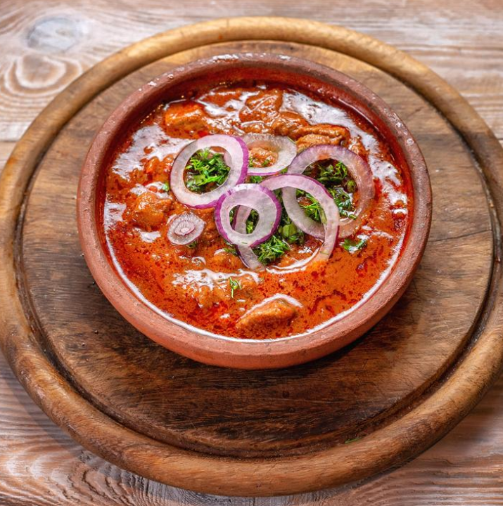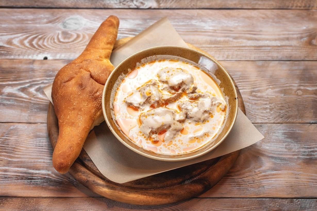 Грузинская окрошка на основе мацони с куриным филе и говяжьим языком. Подается с аджикой и сванской солью.