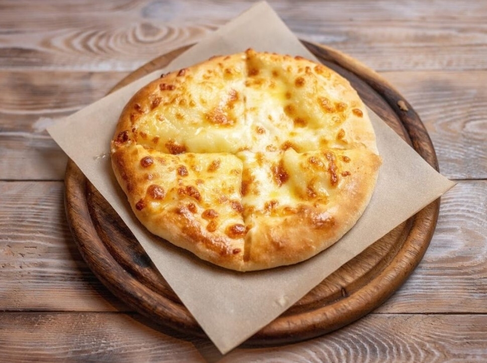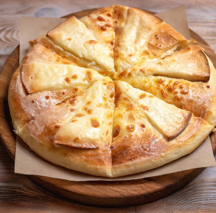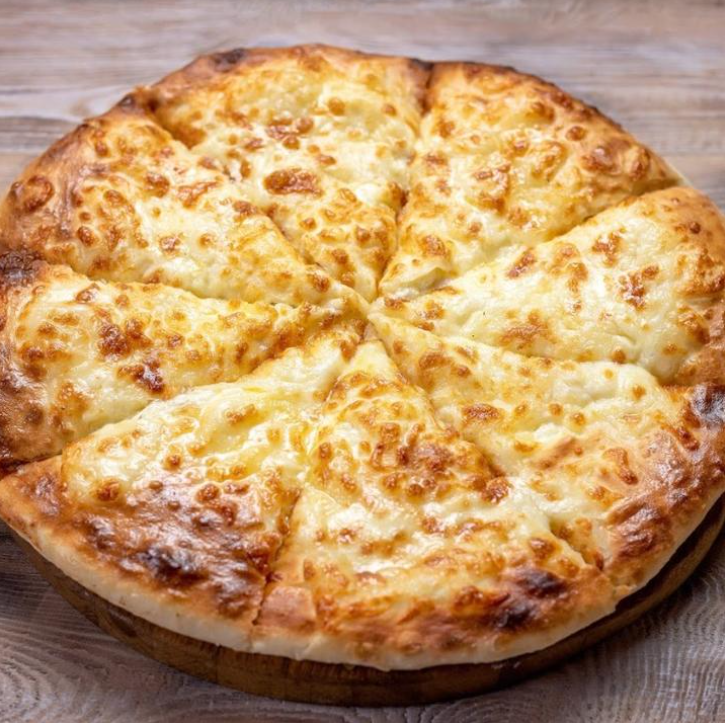 Открытый хачапури с миксом сыров имеретинского и сулугуни внутри и сверху.