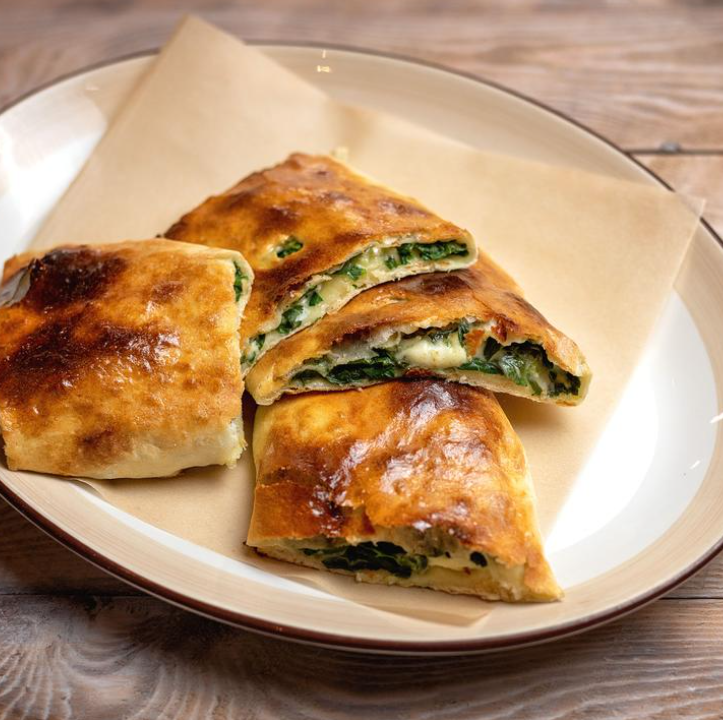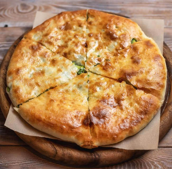 Закрытый хачапури с миксом сыров (сулугуни, имеретинский) и миксом зелени (укроп, петрушка, кинза, зелёный лук).