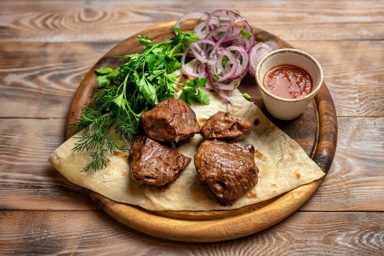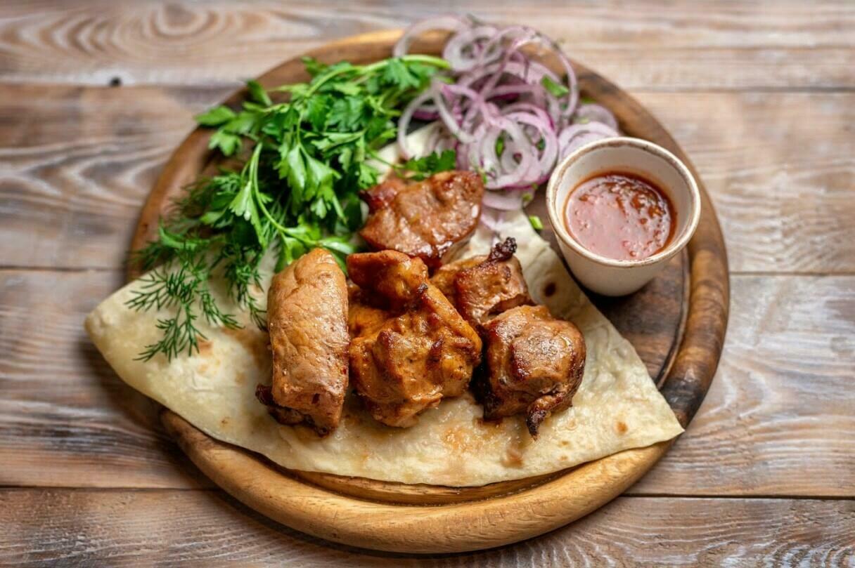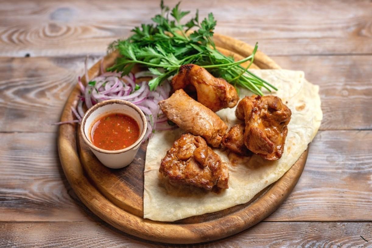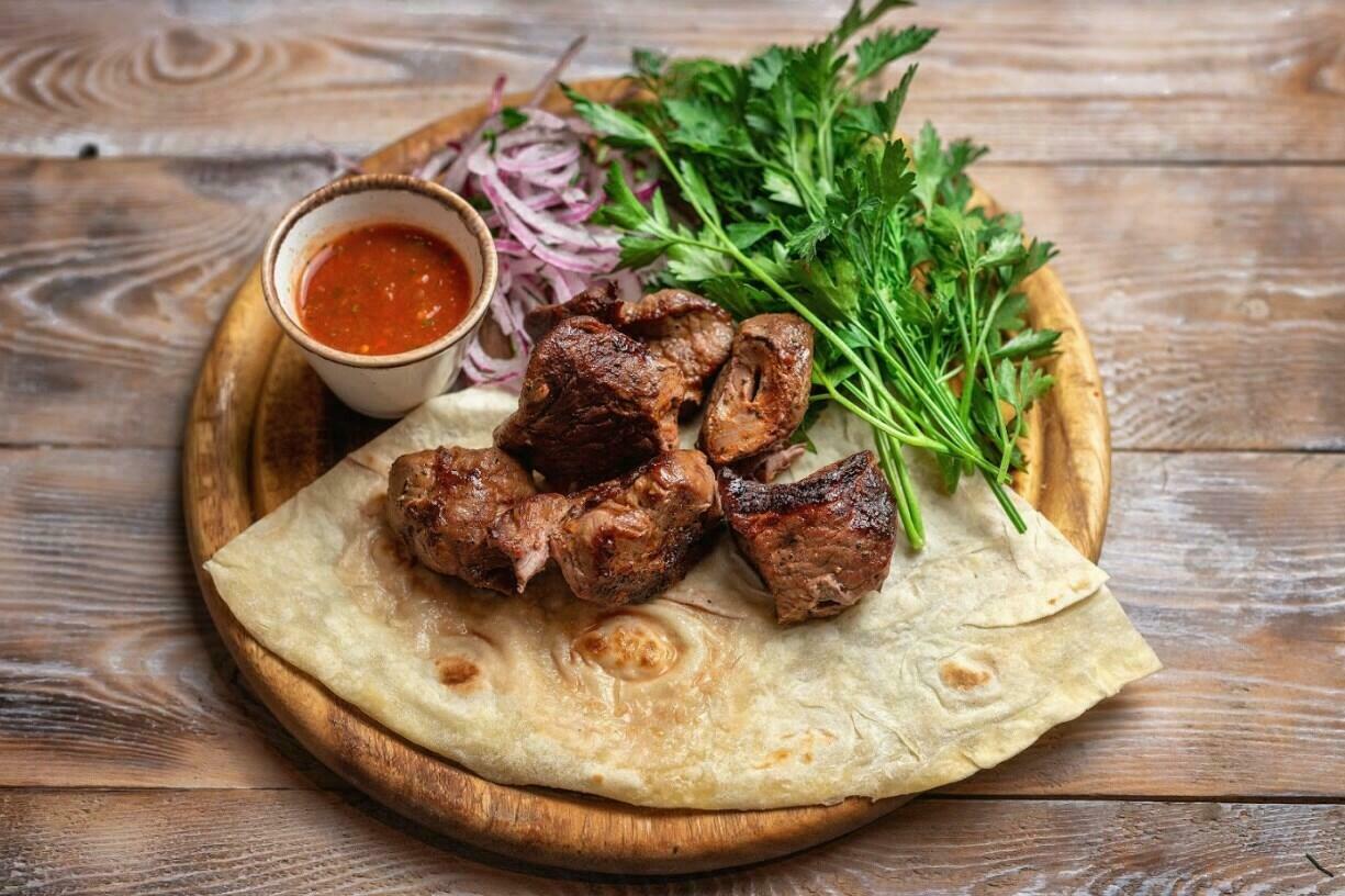 Подается на лаваше с ароматной зеленью, маринованным луком и соусом Сацебели