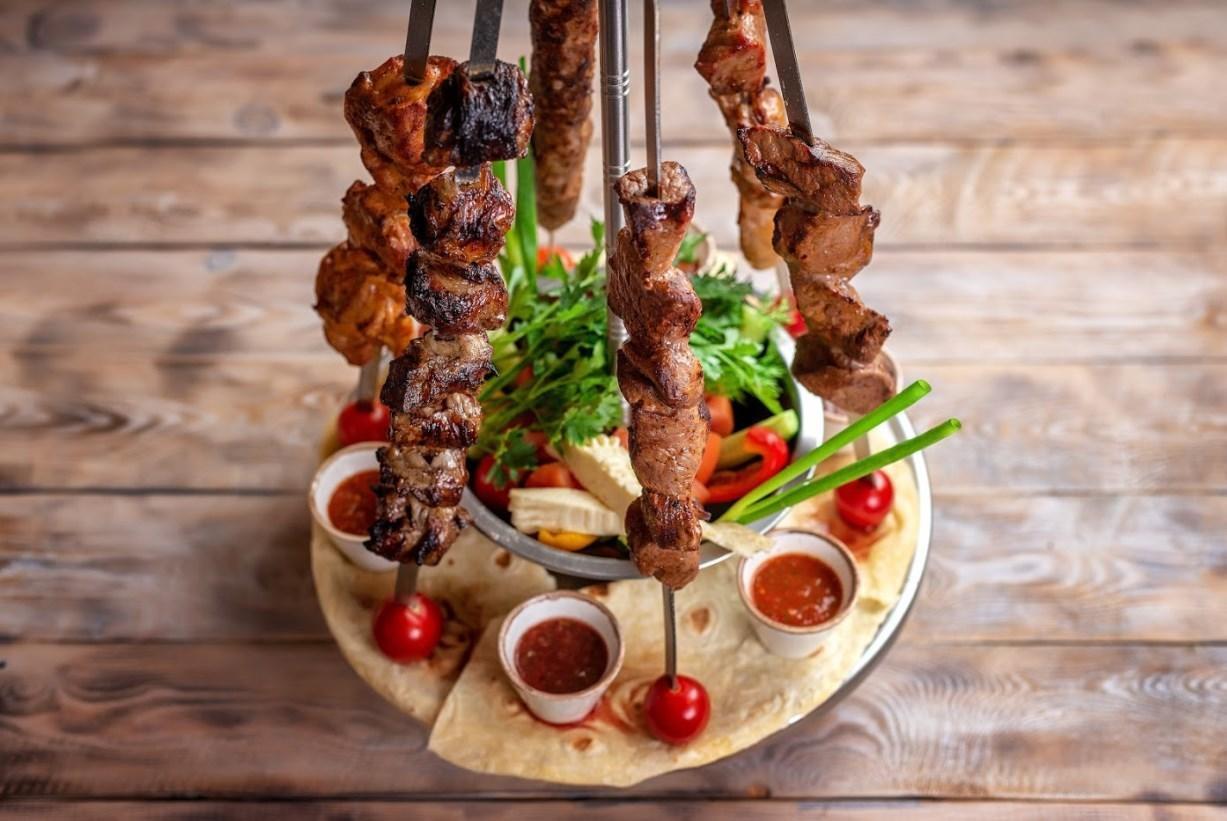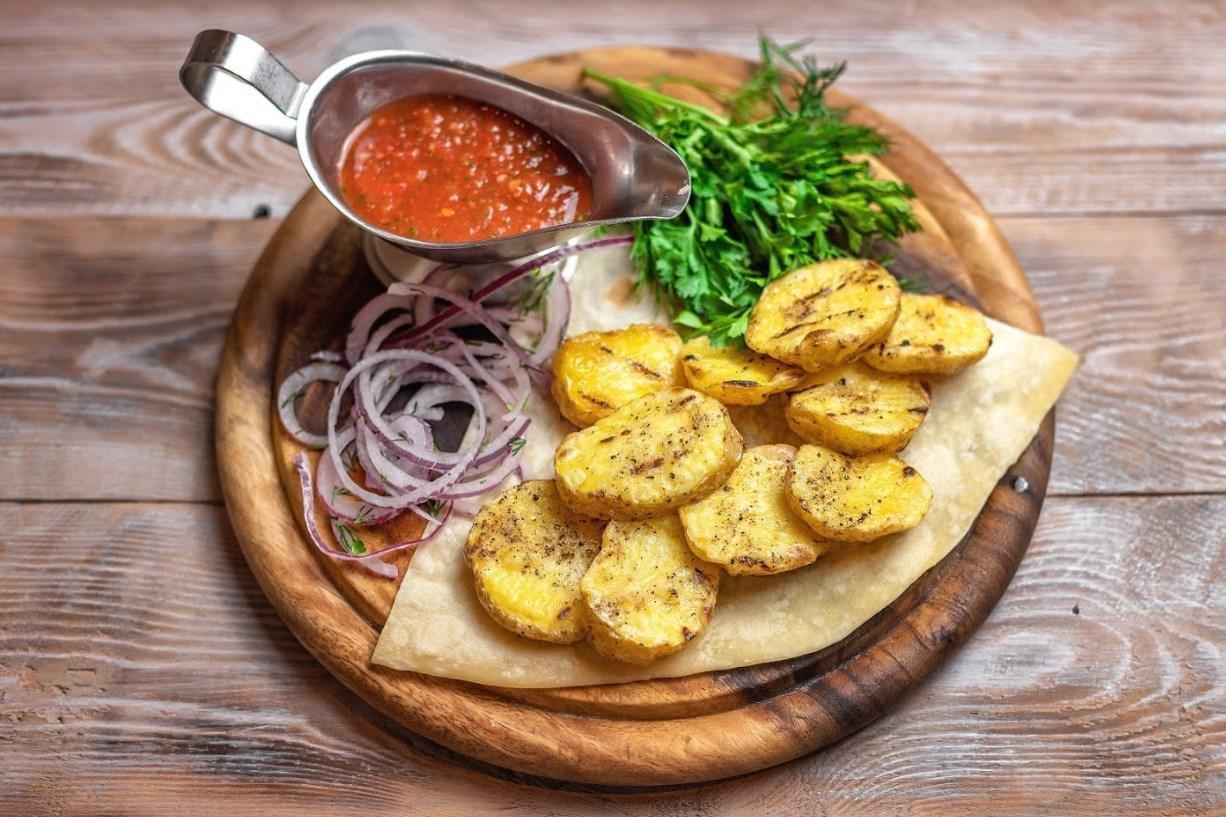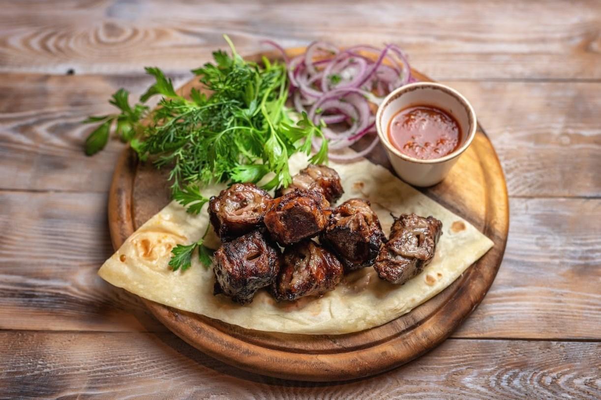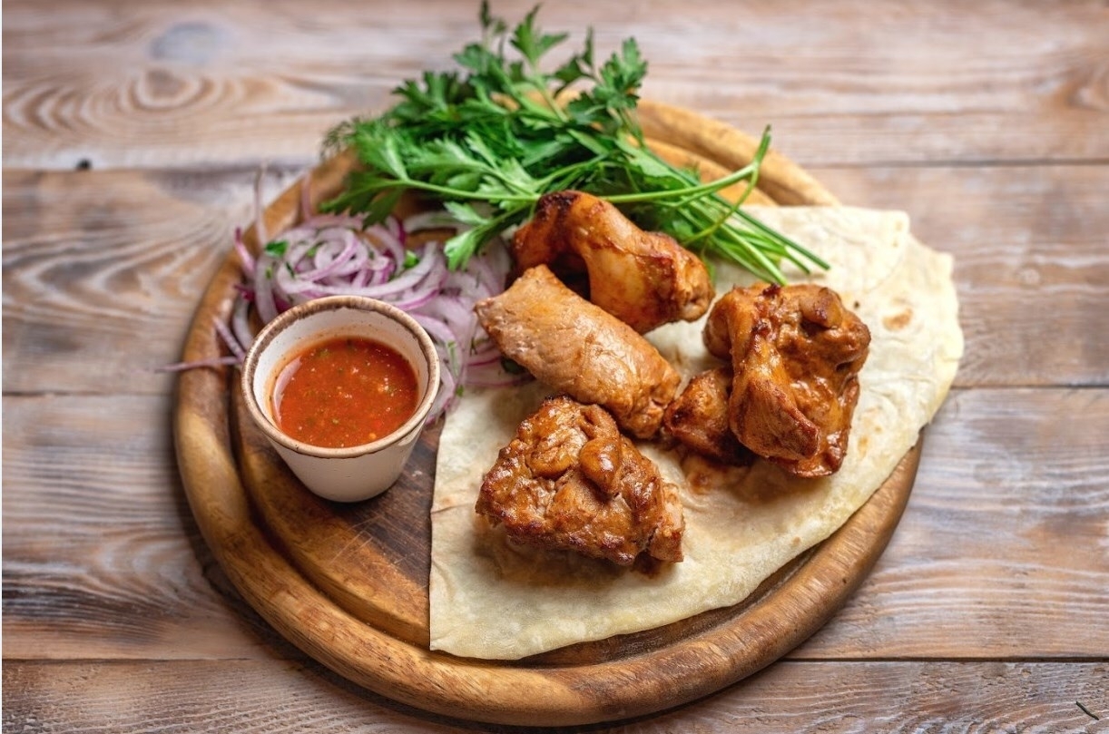 Подается на лаваше с ароматной зеленью, маринованным луком и соусом Сацебели