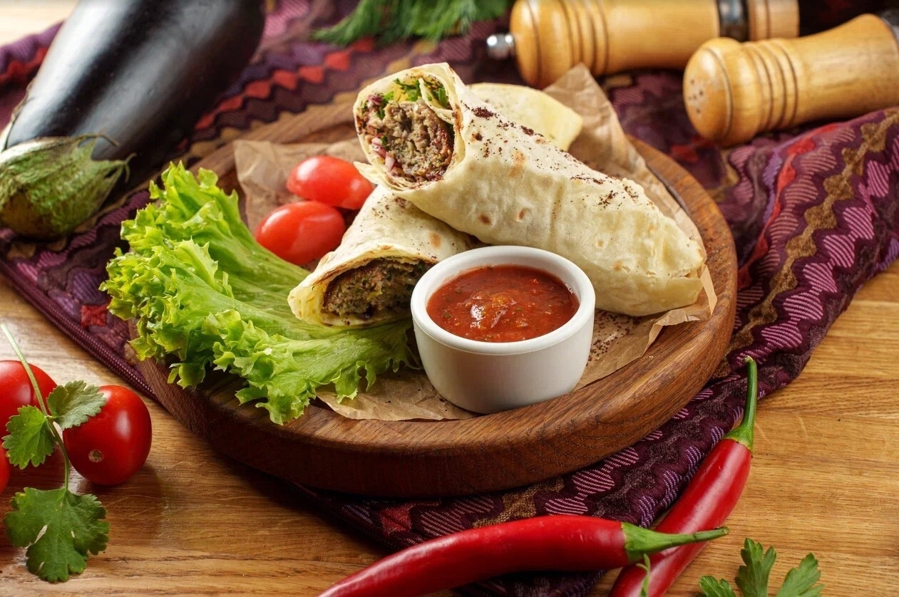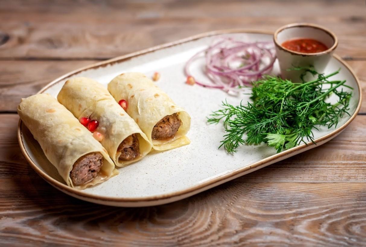 В домашнем лаваше, с зеленью, красным луком и соусом Сацебели.