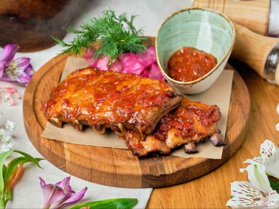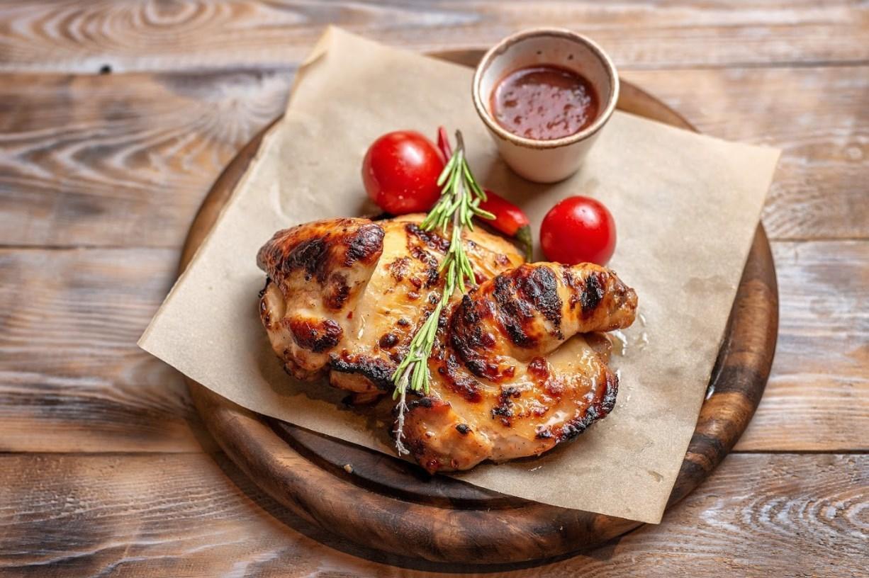 Запеченный по фирменному рецепту цыпленок с чесночным соусом.