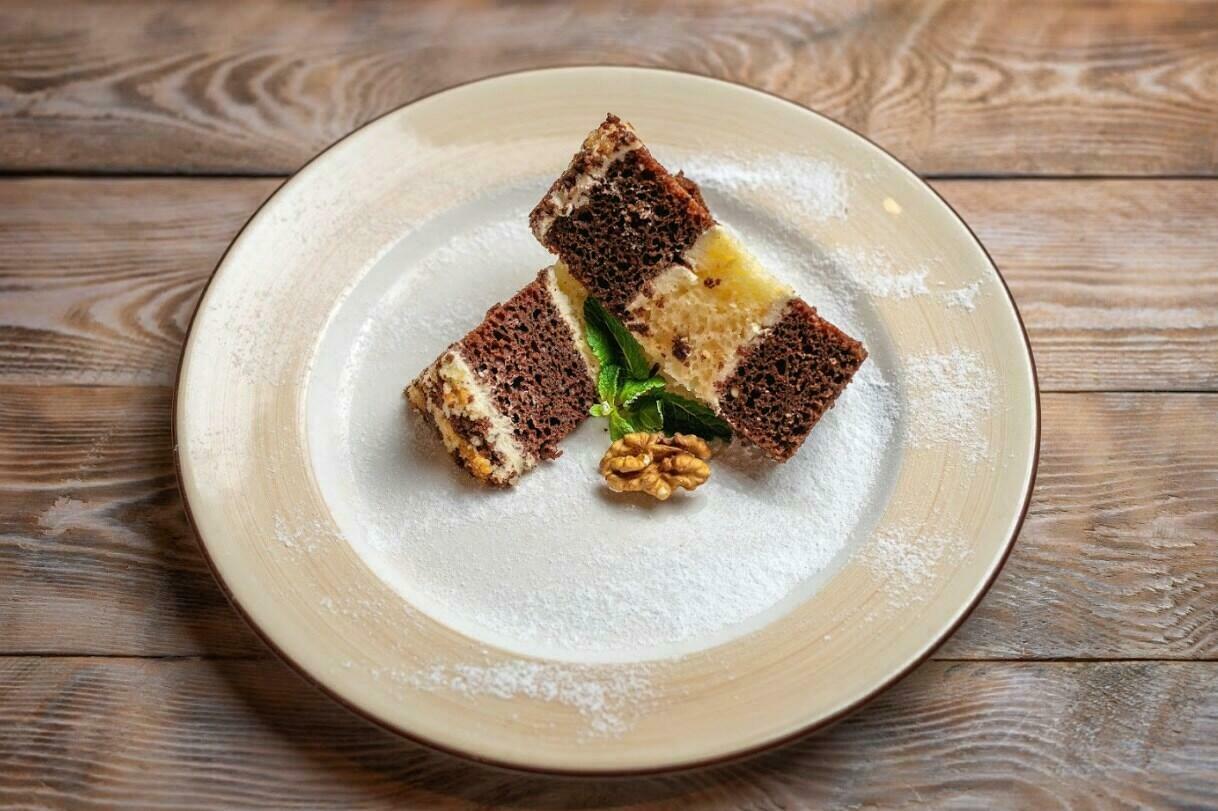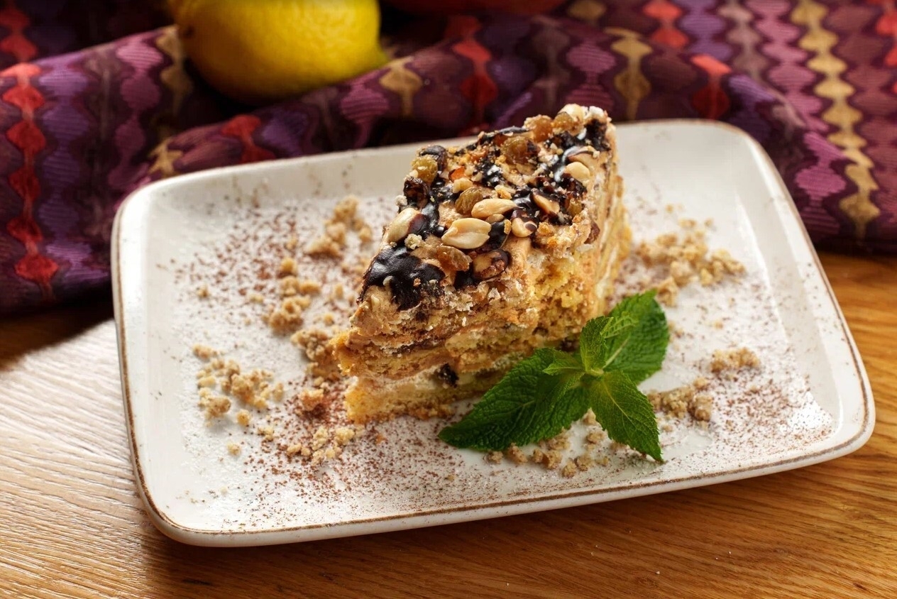 Фирменный торт с добавлением орехового микса, мятой и шоколадным топпингом