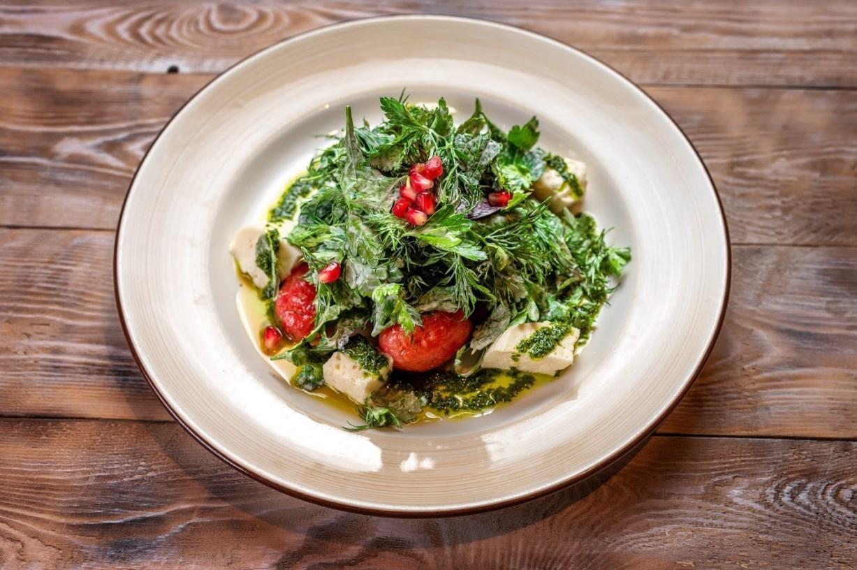 Подается со свежей зеленью и зернами граната.