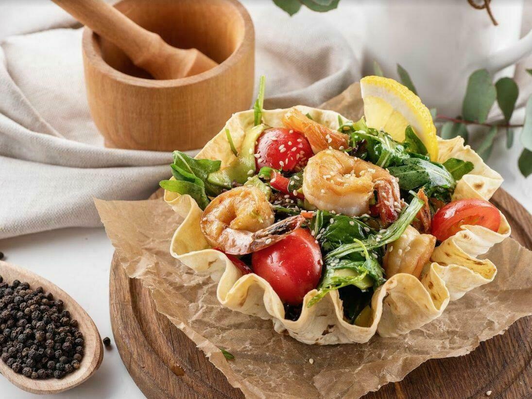 Креветки, тушенные с болгарским перцем, томатами, луком и