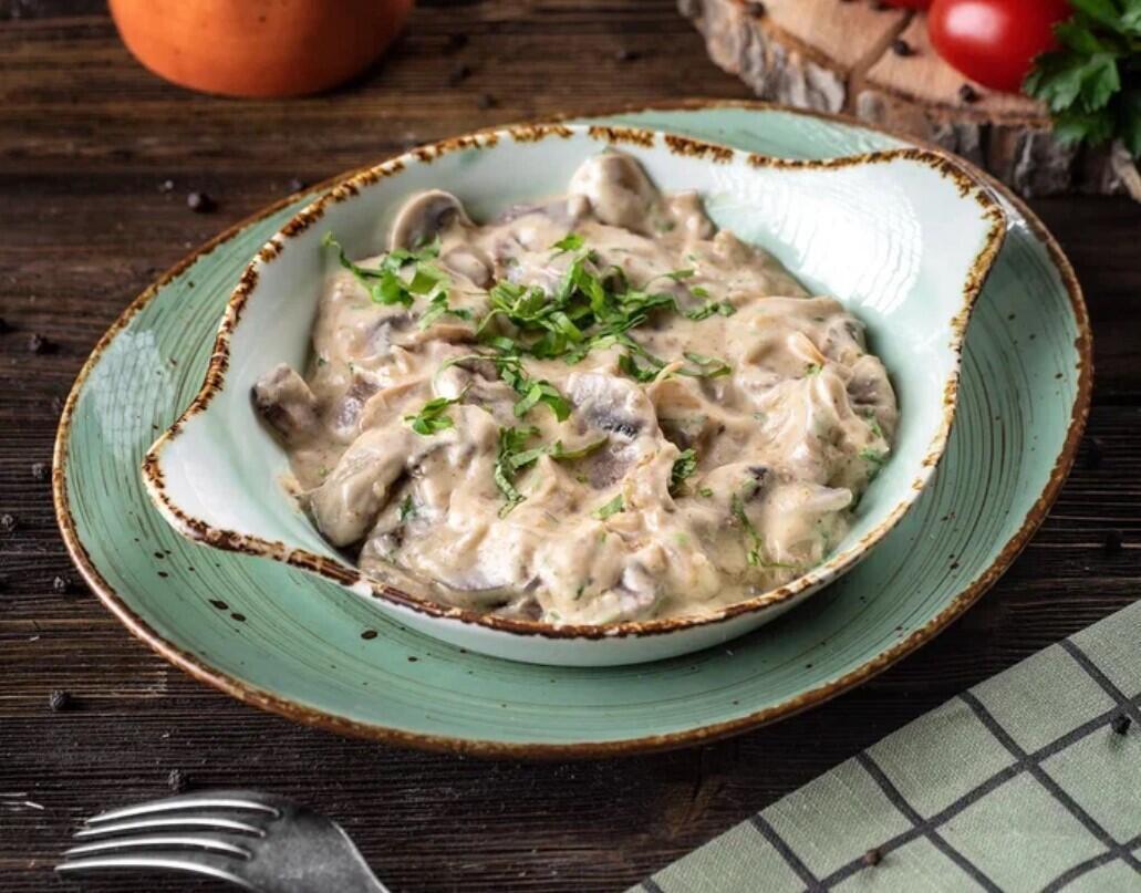 Язык говяжий со шпинатом, грибами, баклажанами, в сливочном соусе с грузинскими специями и кинзой.