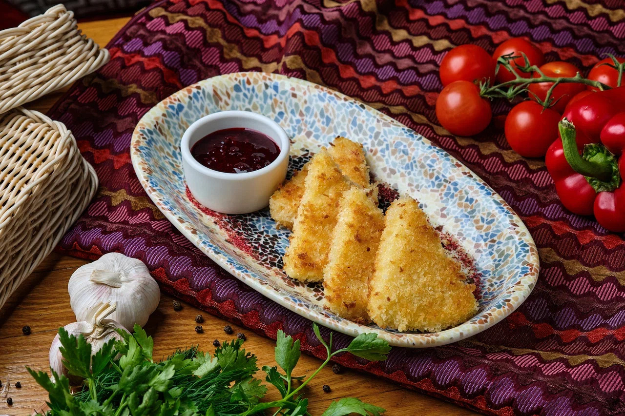 Обжаренный в панировке сыр сулугуни. Подается с ягодным соусом