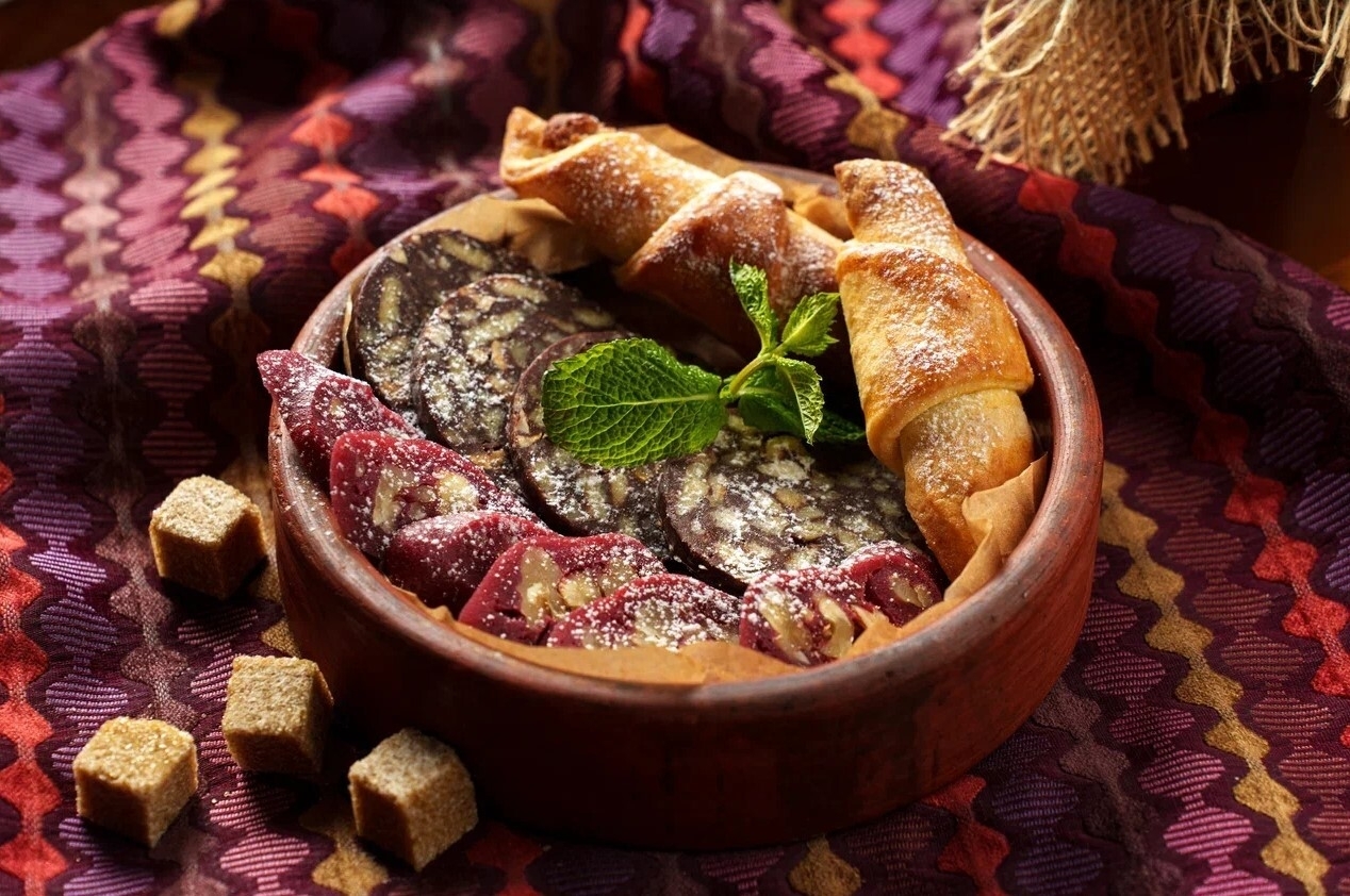 шоколадная колбаса и рогалики с ореховой начинкой.