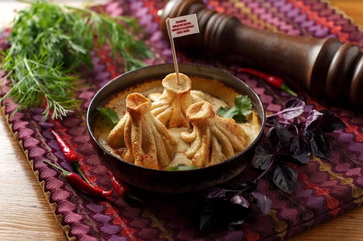Жареные хинкали в сливочном соусе из копченого сулугуни