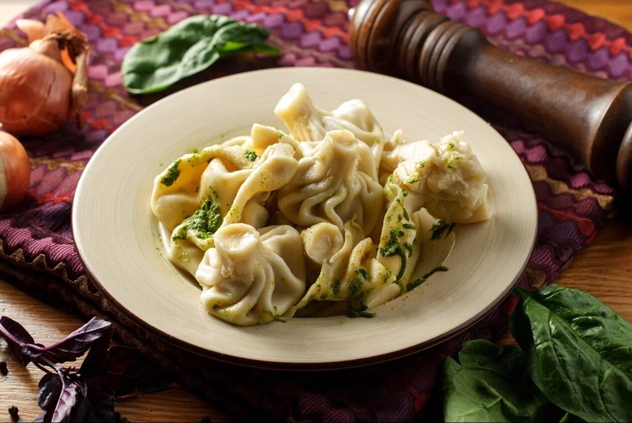 Большая порция хинкали с телятиной, свининой и зеленью в большой Мама Хинкали. Подается с зеленым соусом.