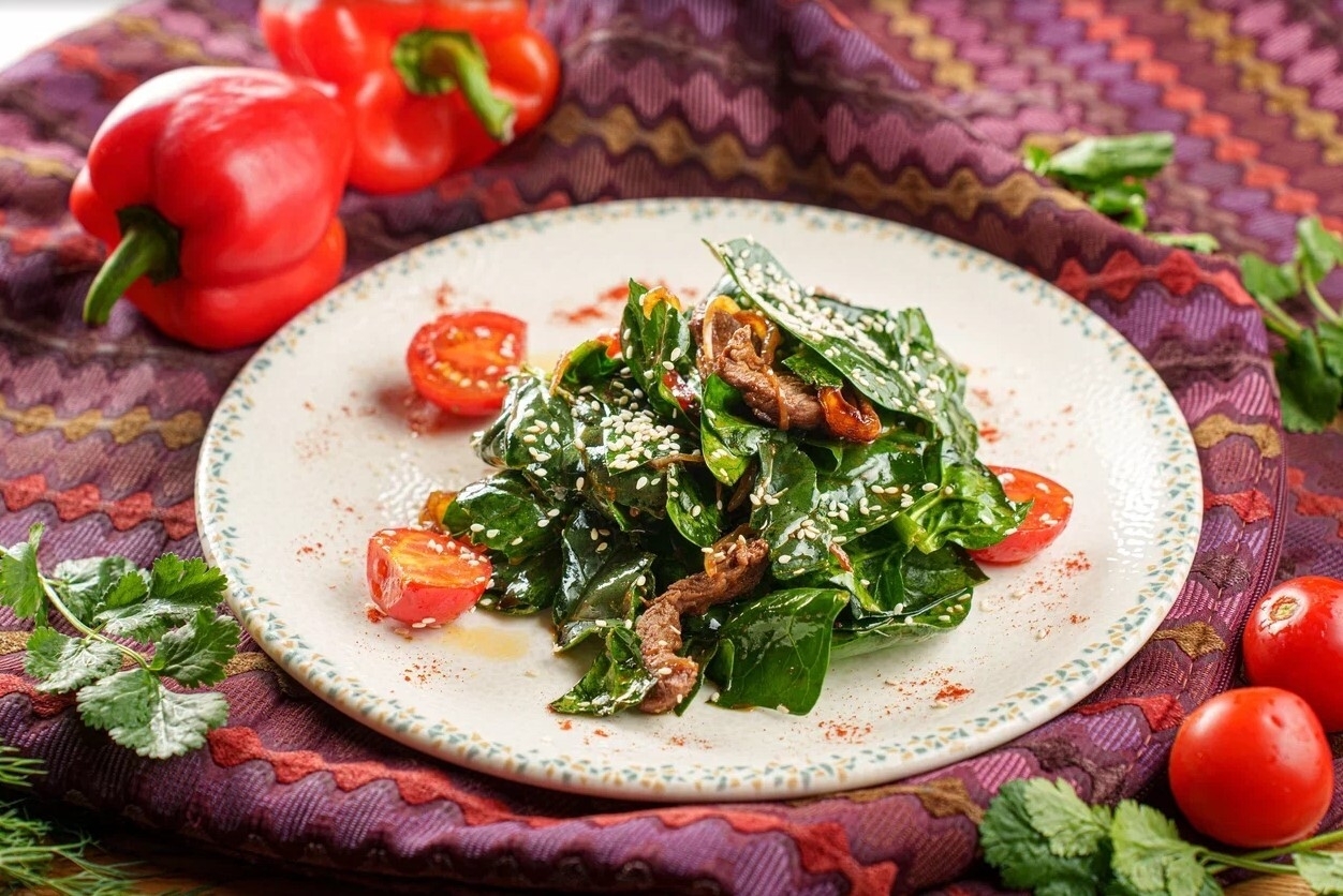 Шпинат, черри, говяжья вырезка, болгарский перец, кунжут, заправка фирменная, специи