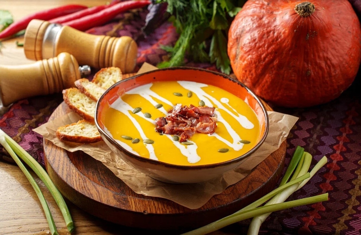 Подается сливками, обжаренным беконом и тыквенными семечками