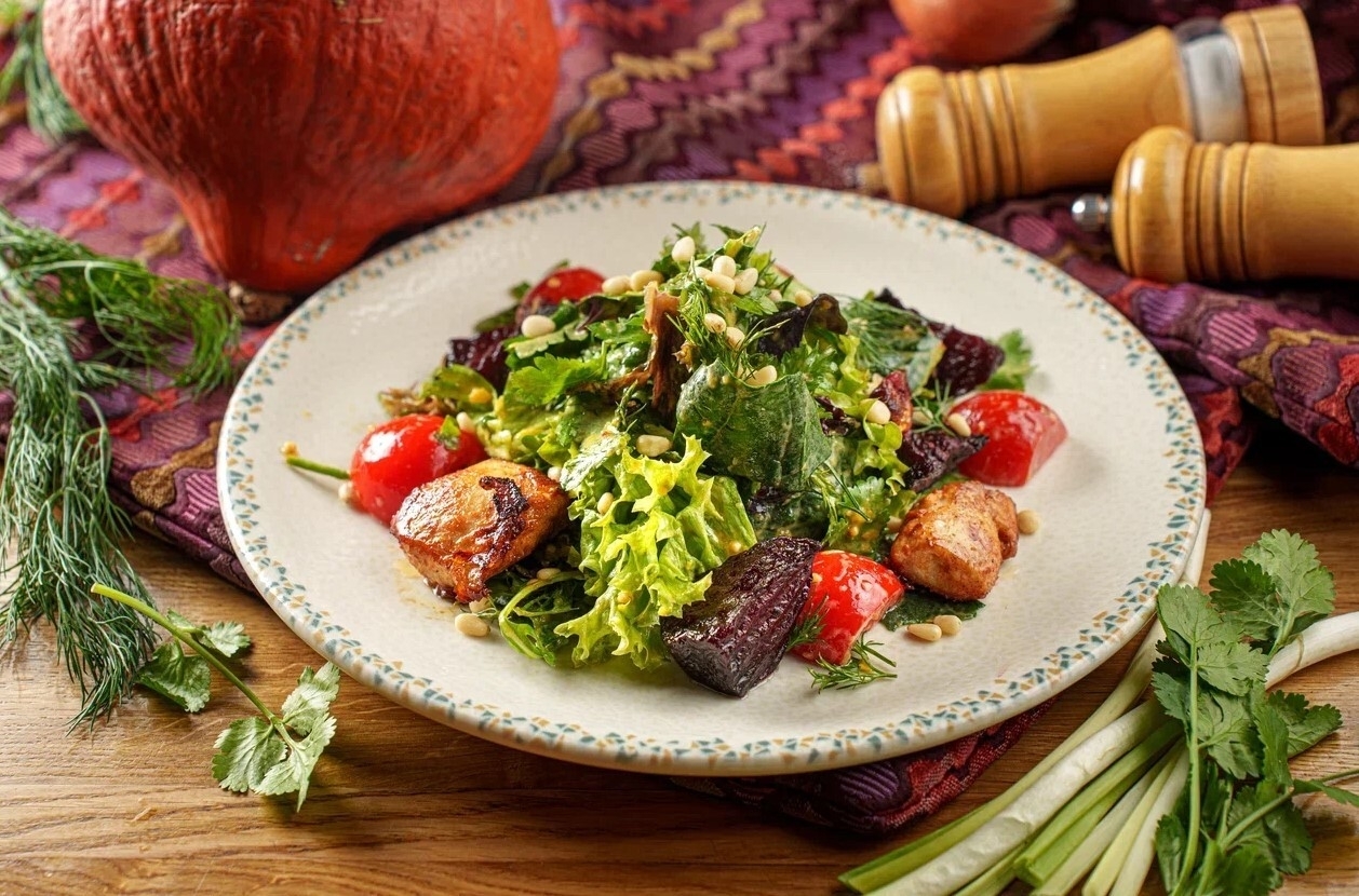 Микс салата, свекла печеная, страчателла, индейка, черри, кедровые орехи, заправка фирменная, специи